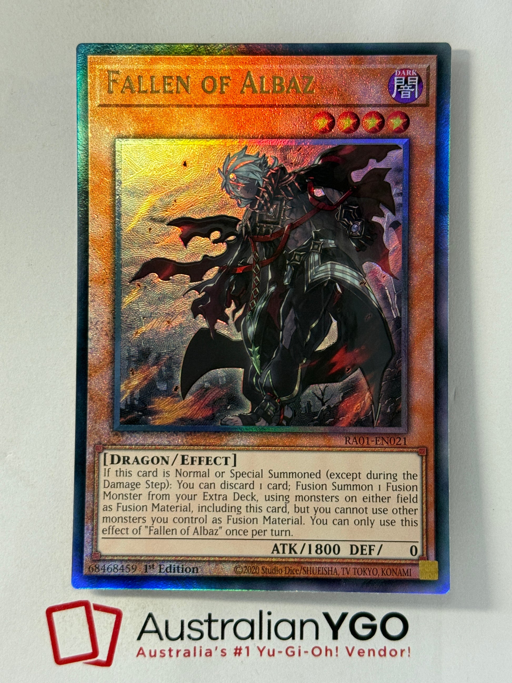 FALLEN OF ALBAZ RA01-EN021 (PUR) Prismatic Ultimate Rare, Near Mint, 1st Edition. Euro
