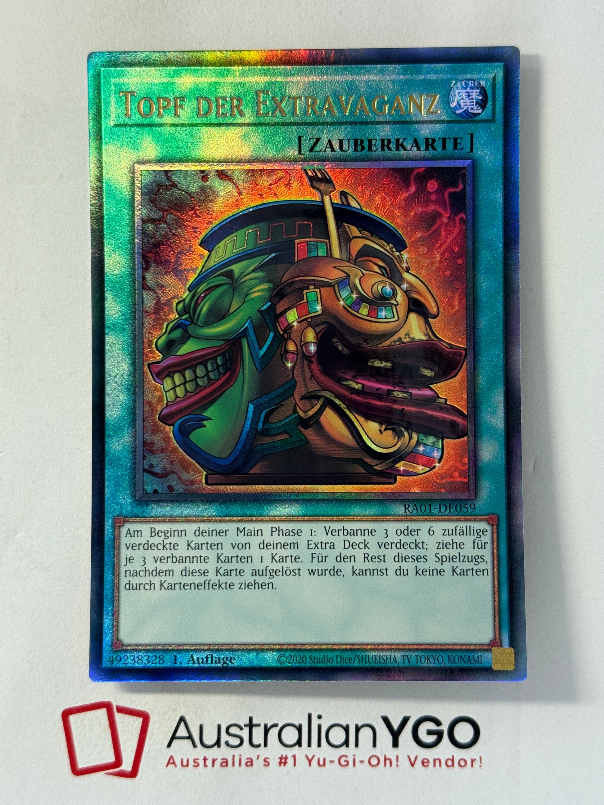 POT OF EXTRAVAGANCE RA01-EN059 (PUR) Prismatic Ultimate Rare, Near Mint, 1st Edition. Euro German