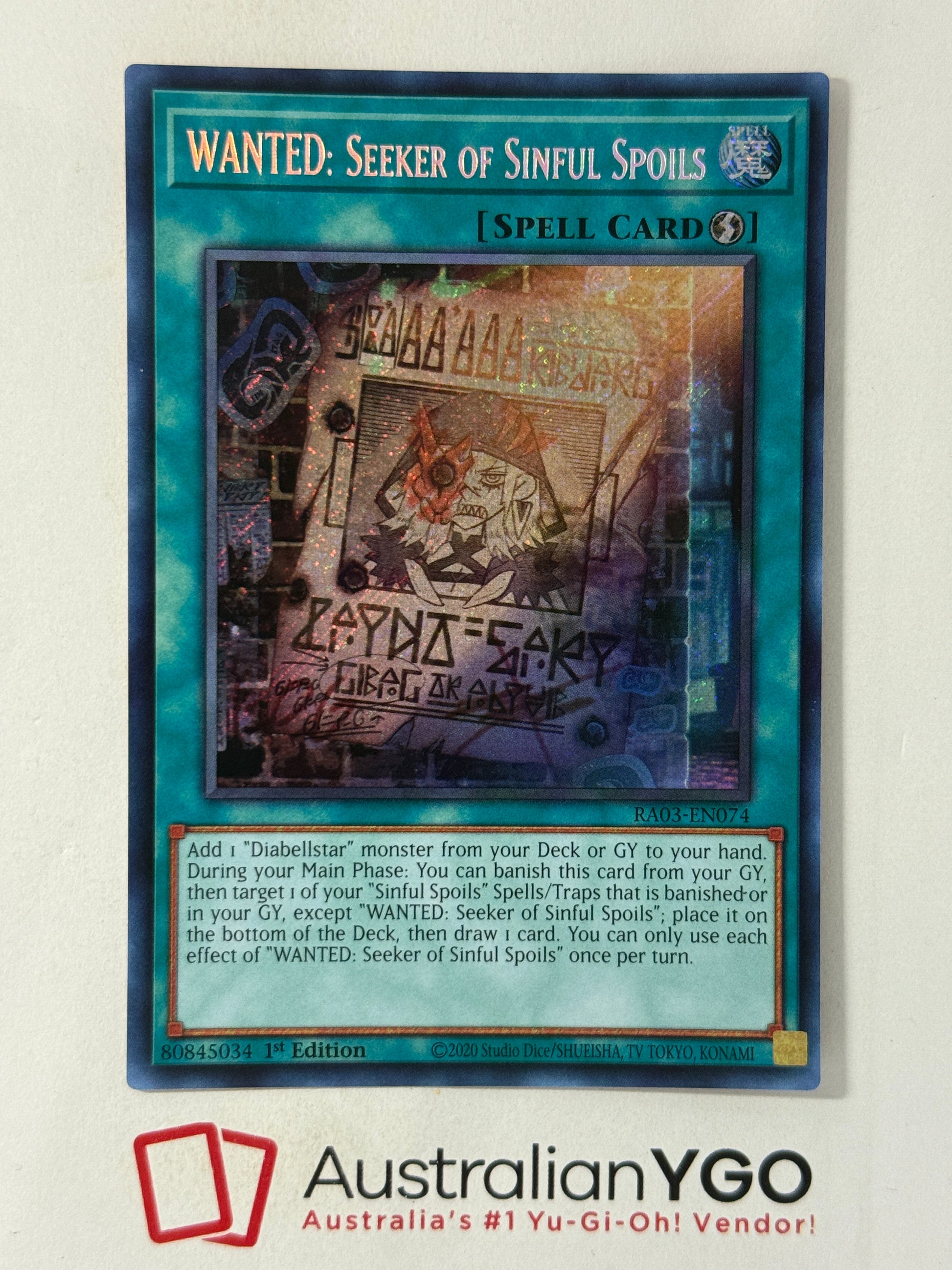 WANTED: SEEKER OF SINFUL SPOILS RA03-EN074 Secret Rare, Near Mint, 1st Edition. American