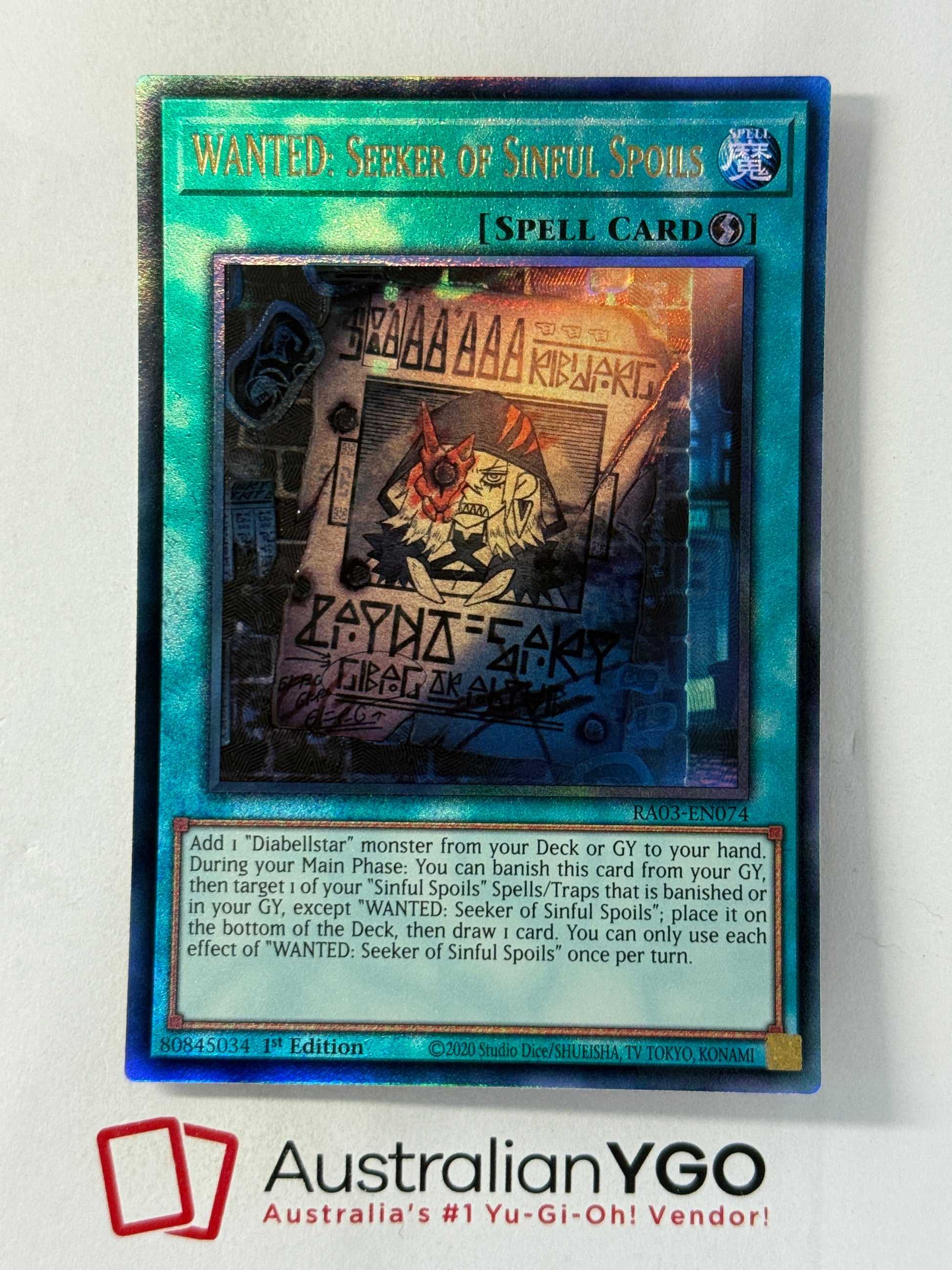 WANTED: SEEKER OF SINFUL SPOILS RA03-EN074 (PUR) Prismatic Ultimate Rare, Near Mint, 1st Edition. Euro